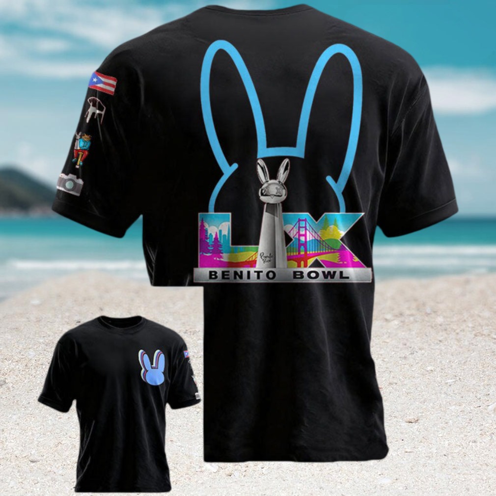 ()▶️ About Bad Bunny Benito Bowl LX Black Neon Logo Fan T Shirt – 3D T-Shirt