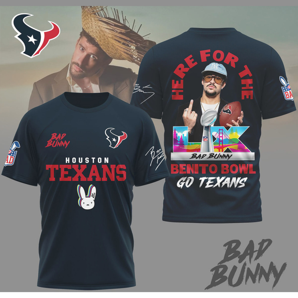 ()▶️ About Bad Bunny Houston Texans Benito Bowl Super Bowl 60 Graphic Game Day Shirt – 3D T-Shirt