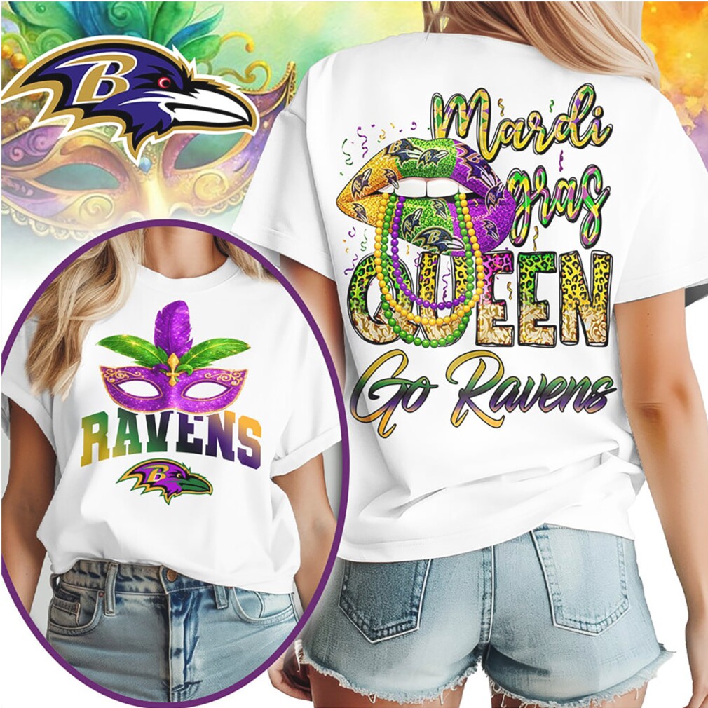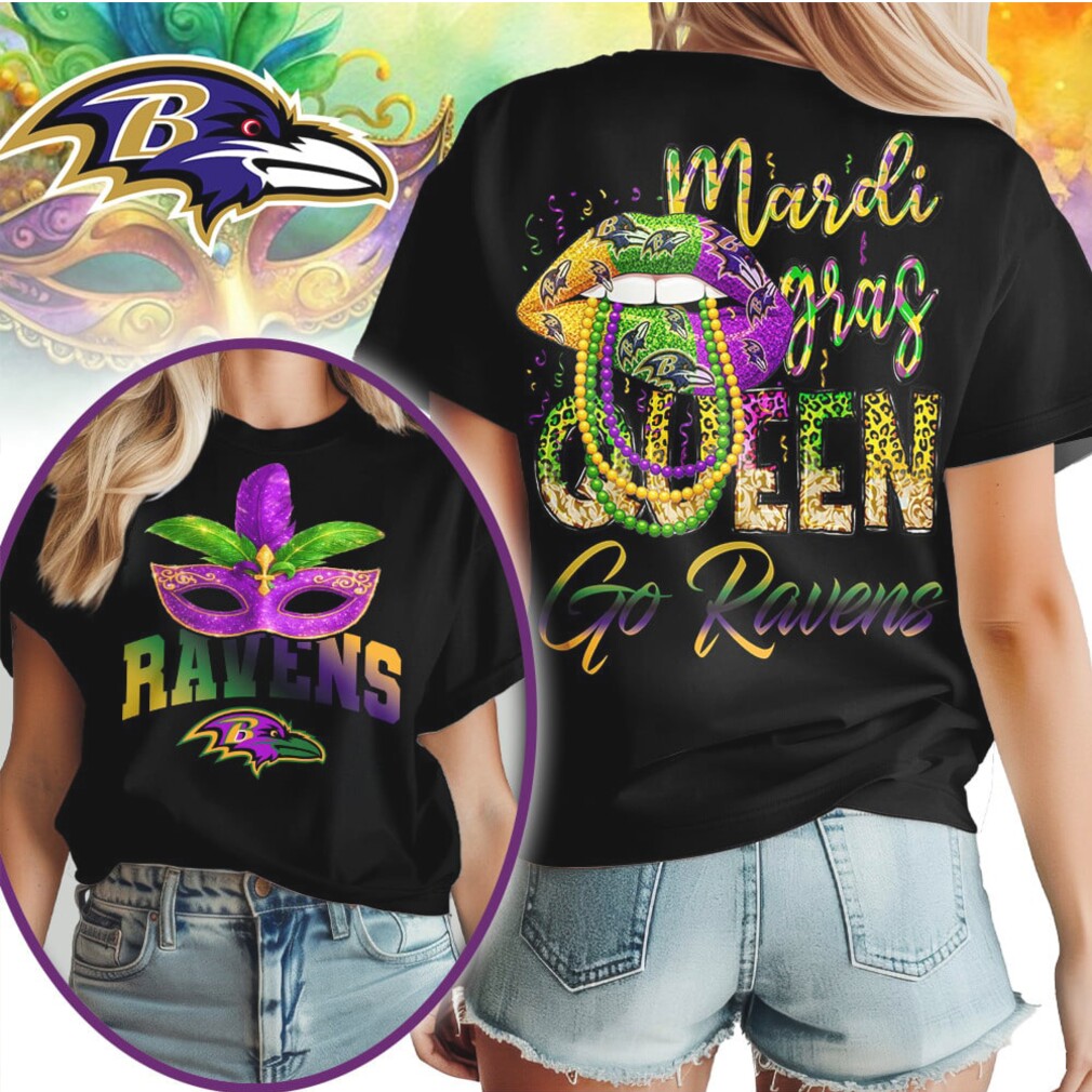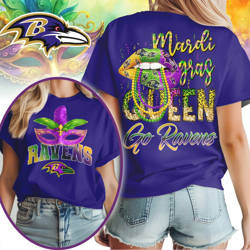 ()▶️ About Baltimore Ravens Mardi Gras Queen Festive Football Fan Celebration Graphic T Shirt – 3D T-Shirt