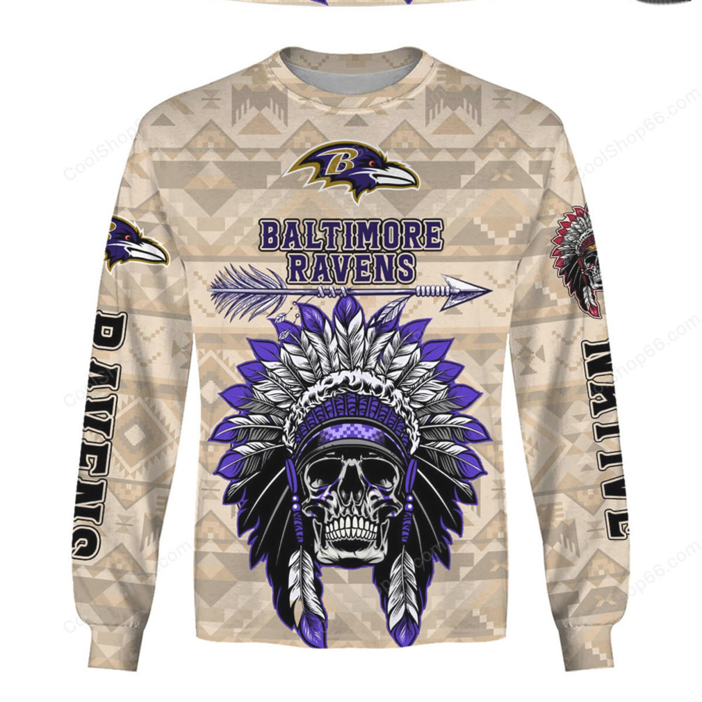 ▶️ About Baltimore Ravens Tribal Skull Headdress Fan Gear Hoddie – 3D T-Shirt