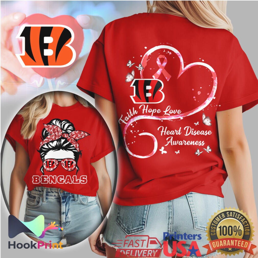 ▶️ About Cincinnati Bengals Messy Bun Heart Disease Awareness Faith Hope Love T Shirt – 3D T-Shirt
