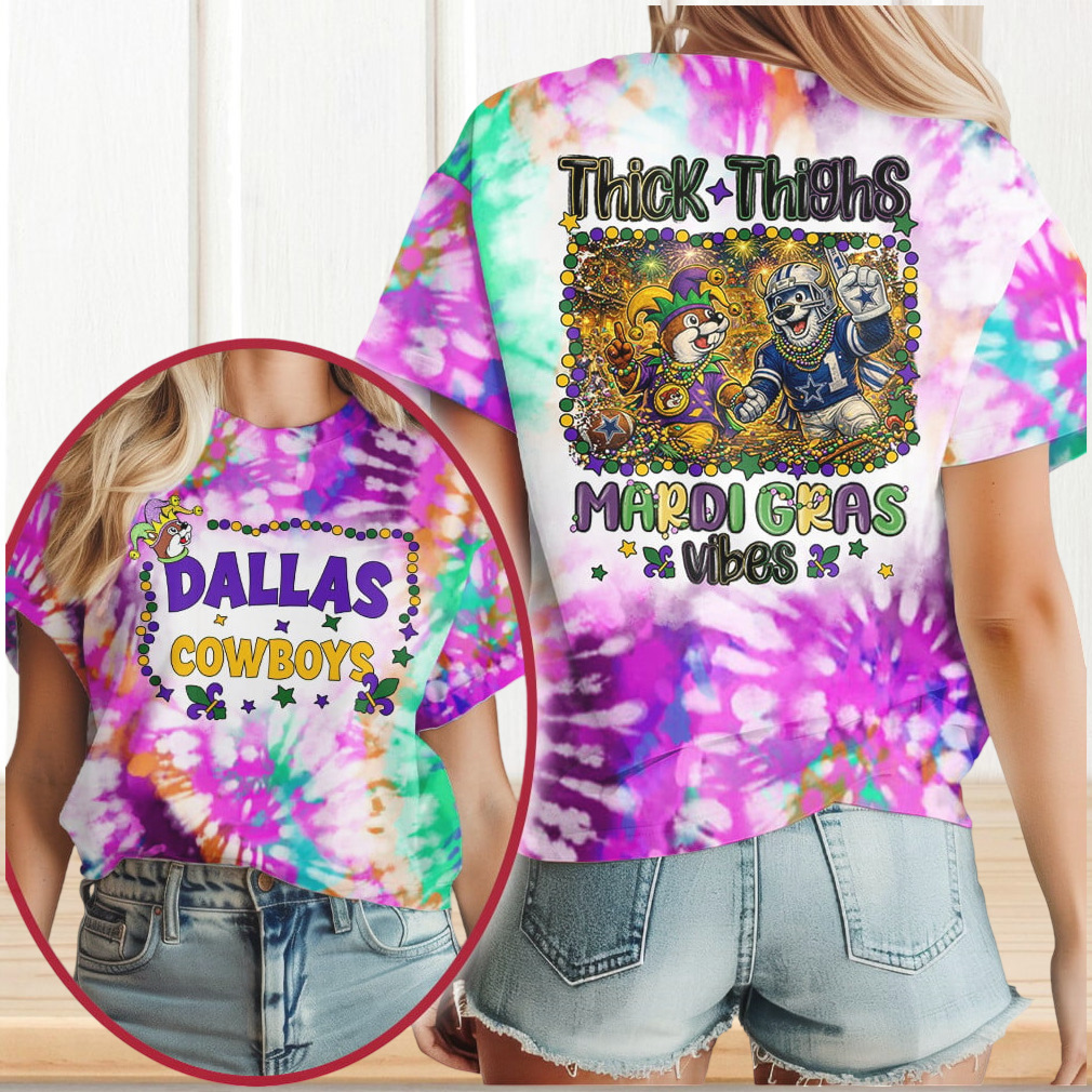▶️ About Dallas Cowboys Mardi Gras Vibes Thick Thighs Mascot NFL T Shirt – 3D T-Shirt