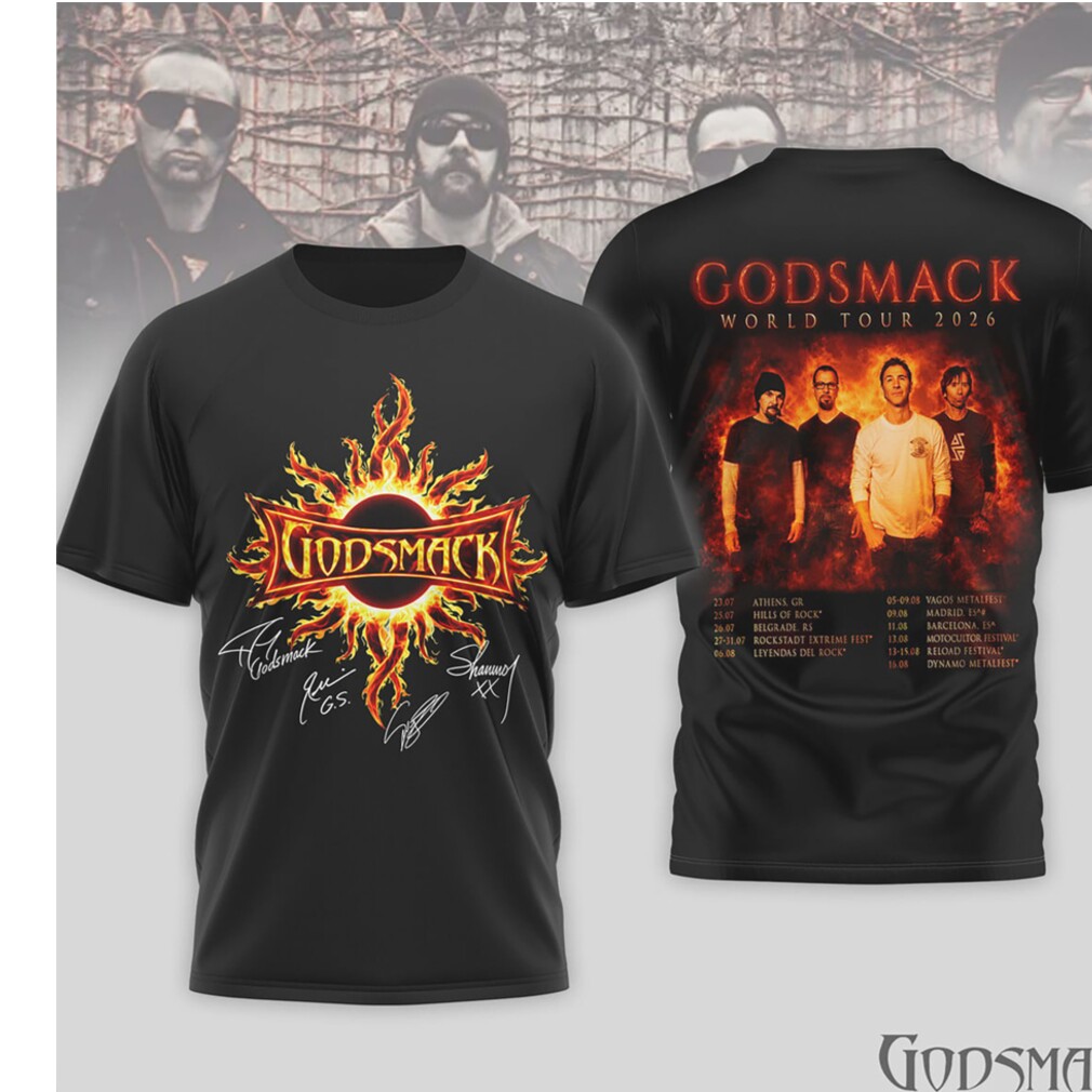 ()▶️ About Godsmack World Tour 2026 Fire Sun Graphic Black Cotton Rock Band Concert Shirt – 3D T-Shirt