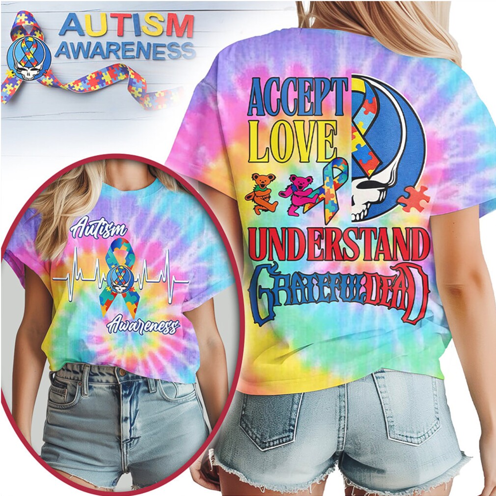 ()▶️ About Grateful Dead Autism Awareness Accept Love Understand Rainbow Tie Dye Puzzle Graphic Shirt – 3D T-Shirt
