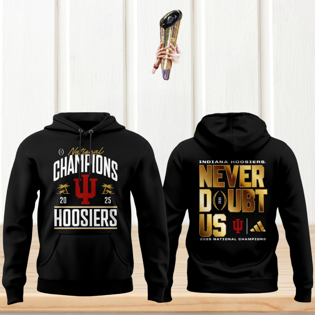 (Hoosiers Champions)Indiana Hoosiers 2025 national champions never doubt us black hoodie v2, V-neck, Sweater Hoodie and Long Sleeve tee
