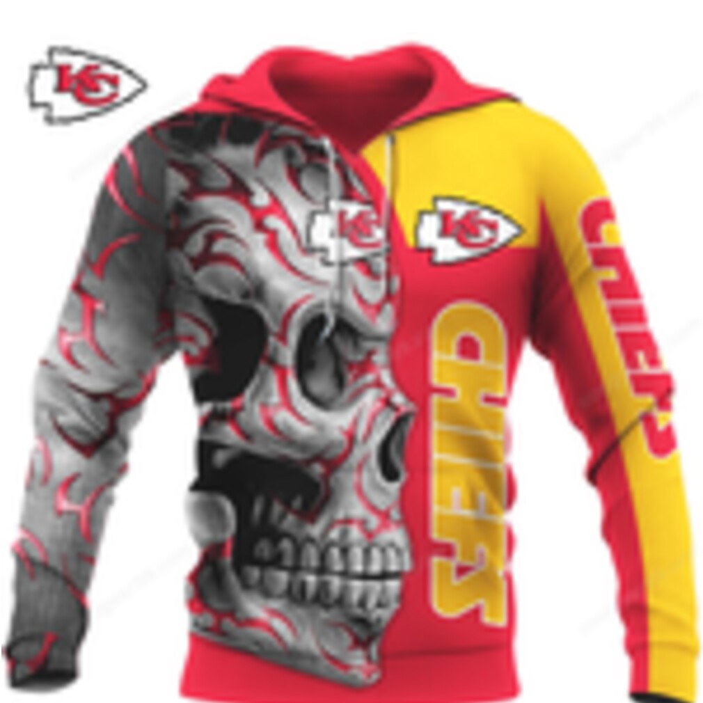 ()Undrafted free agent, throws a touchdown pass 60 yards. Did I give him a good grade? No. Just because you can throw it 60 yards doesn’t mean you’re a great quarterback. In the end, did he betray the Kansas City Chiefs Split Skull Custom Name 3D Hoodie more than his defense? No but that’s the thing you didn’t build a defense, you built an offense. So you have to score at will, you have no choice. Defensively didn’t they register 52 sacks? Yes, but with the lead. When the Chiefs are trailing or the game is tight they are incapable of making plays, they’re not good. They have to play with the lead to generate sacks, otherwise they get squelched. The Chiefs are probably convinced #95 is an All-Pro player but he’s one of the worst defensive tackles in the league at stopping the run with Grady Jarrett. Three straight seasons now that he and Justin Houston are getting run over. You have to be honest with the players you have. And frankly sacks are a little overrated, last year the Eagles had maybe 33 and this year the Patriots 30. The Patriots won this game based of Patrick Mahomes’ tendencies. There’s nothing you can do to completely shut down Tyreek Hill. Twice in a row that in two games he falls behind, that just can’t happen.