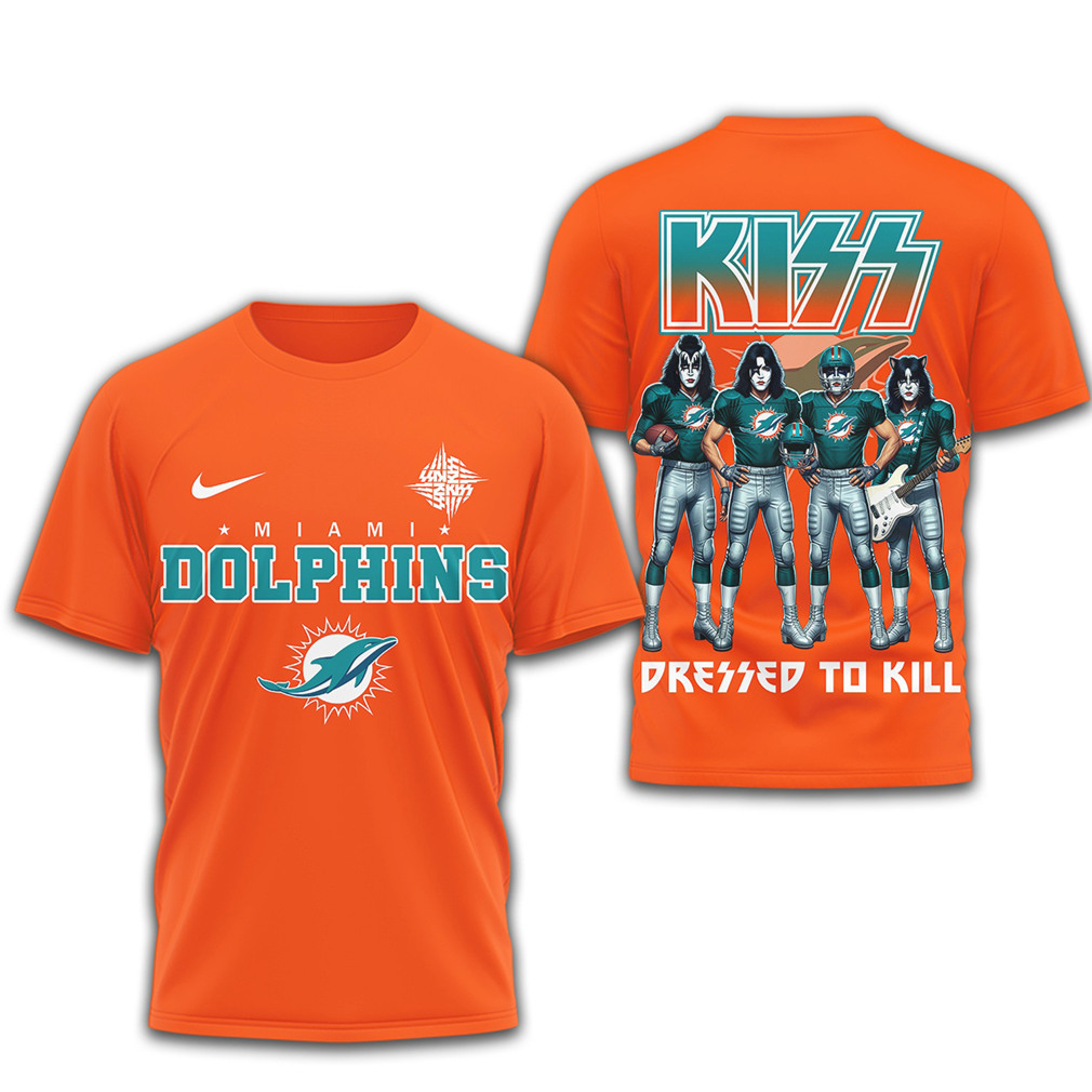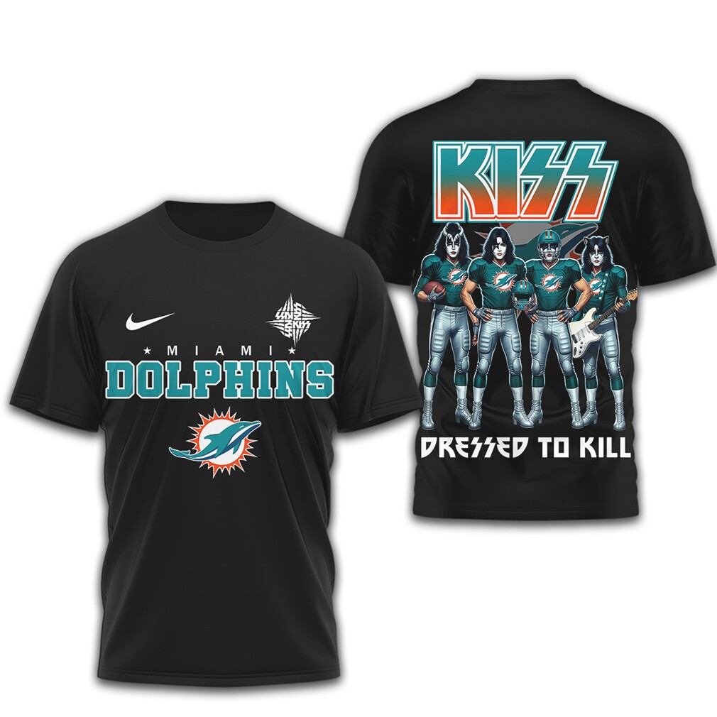 ▶️ About KISS x Miami Dolphins Dressed To Kill Vintage Rock NFL T Shirt – 3D T-Shirt