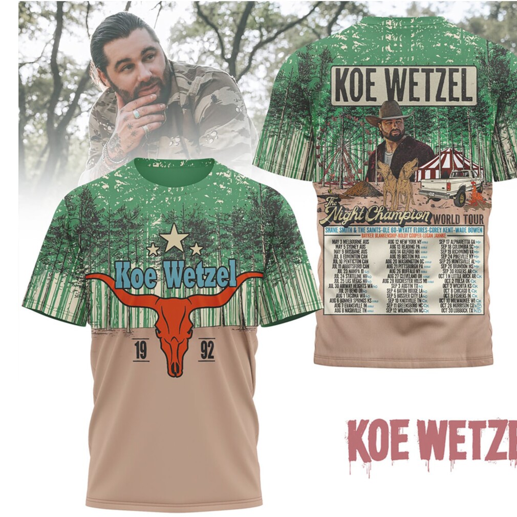 ▶️ About Koe Wetzel Night Champion World Tour 2026 Longhorn Graphic Shirt – 3D T-Shirt