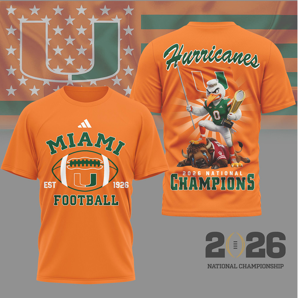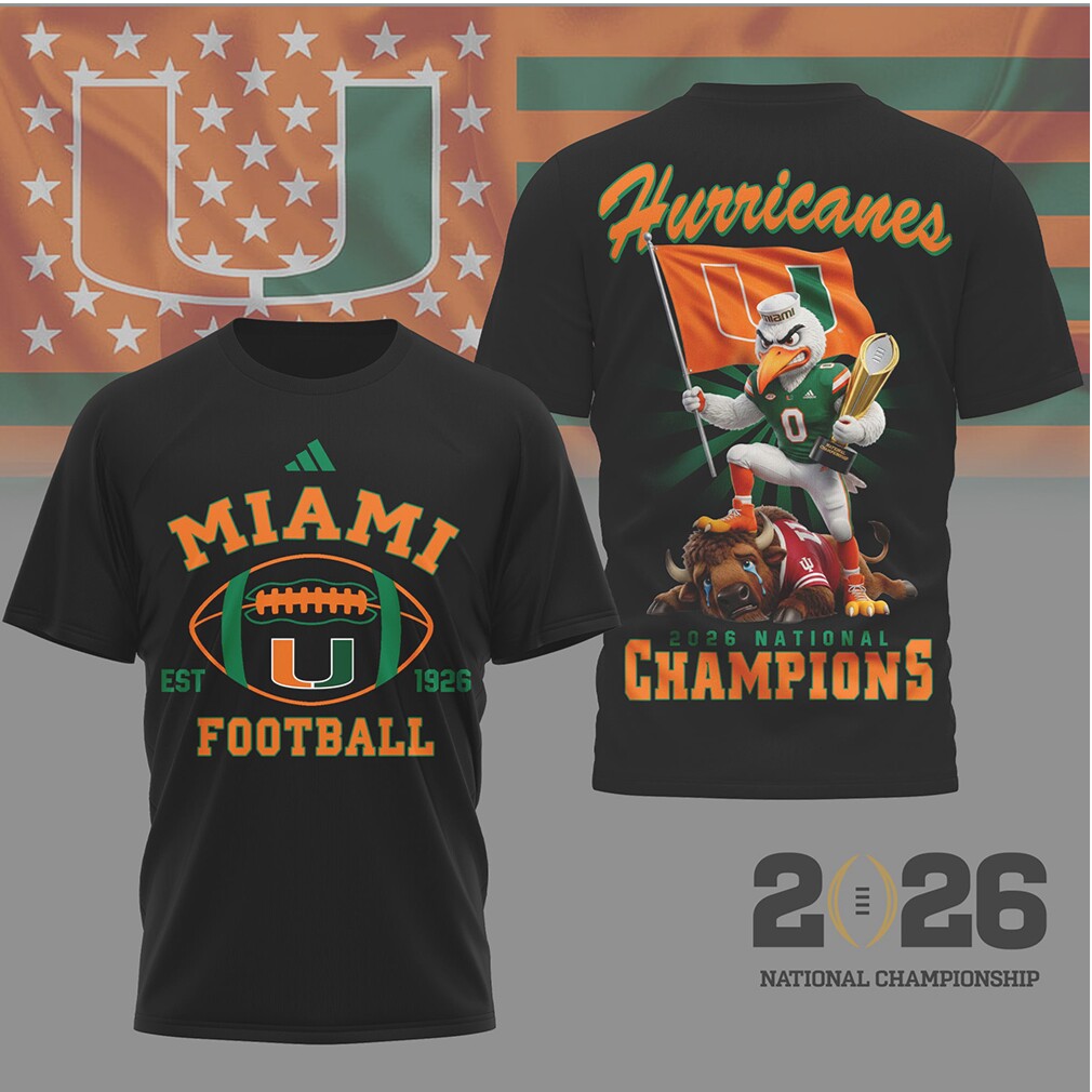 Miami Hurricanes 2026 National Champions Sebastian Mascot Trophy Victory Shirt