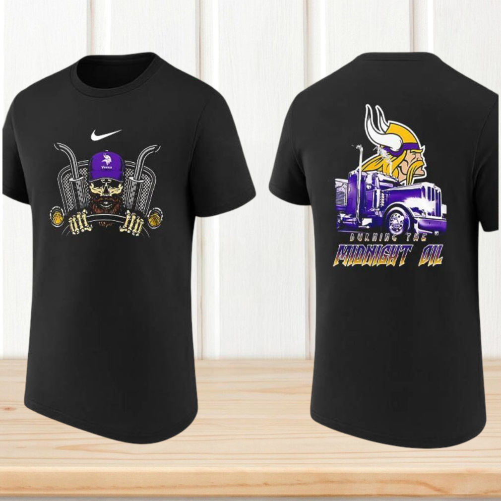 In contrast, when Allen produces a turnover-heavy postseason game, the conversation often widens outward. Officiating decisions, late-game sequences, and an Minnesota Vikings Burning The Midnight Oil Trucker Skull Football Fan T Shirt occupy significant space. The quarterback’s mistakes are acknowledged, but they are frequently positioned as part of a larger chain of events rather than the central cause.