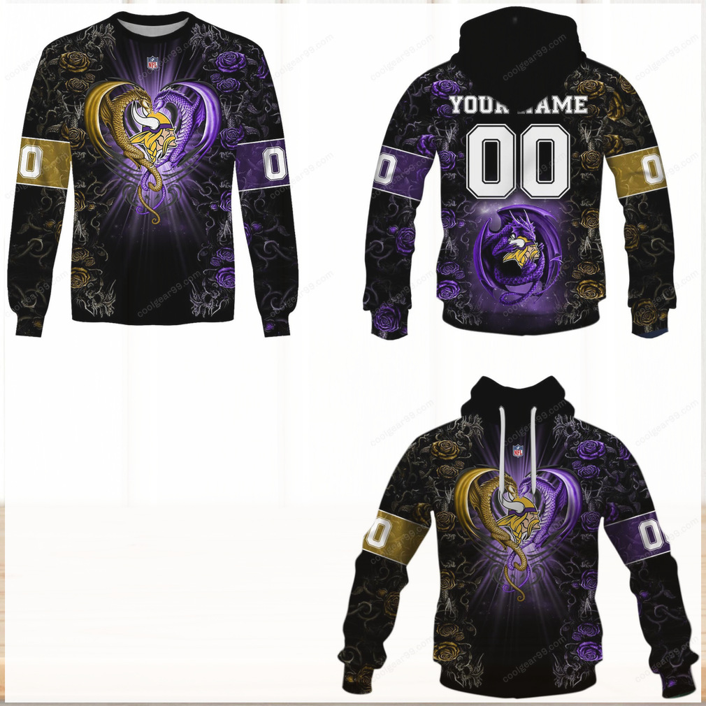 ▶️ About Minnesota Vikings Custom Rose Dragon Apparel Collection Hoodie – 3D T-Shirt