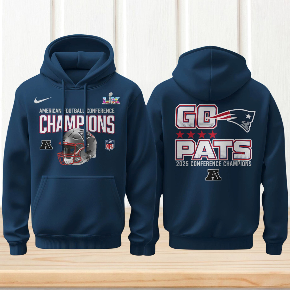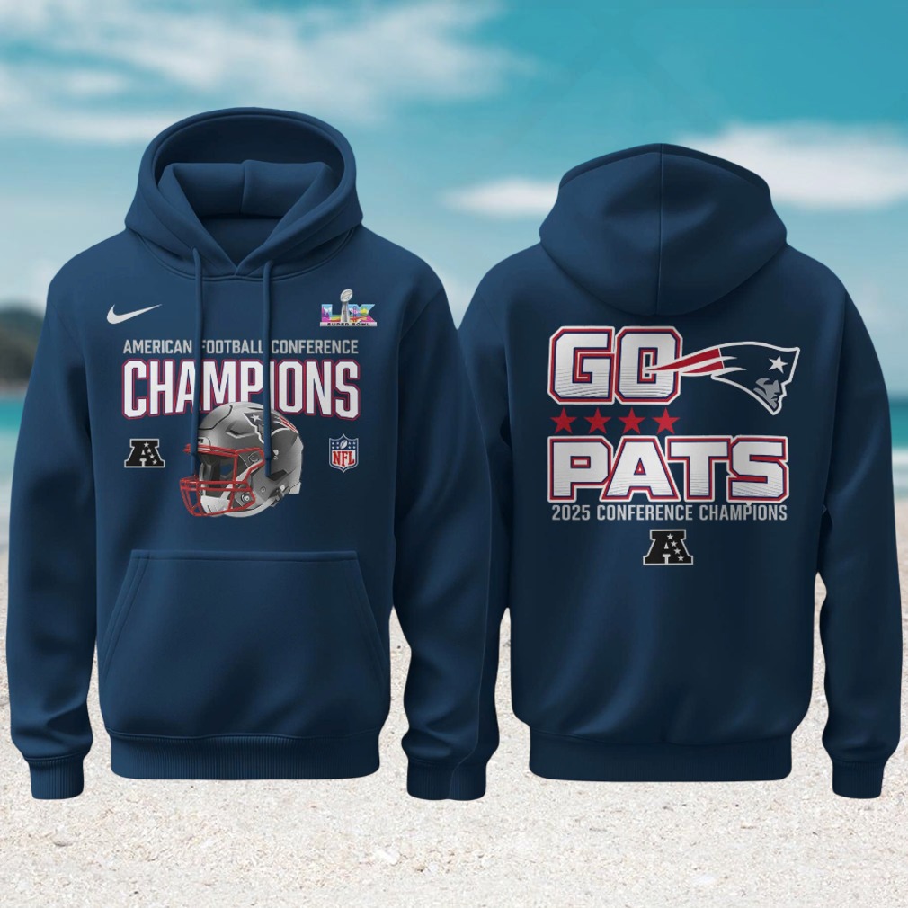 ()▶️ About New England Patriots 2025 Conference Champions Go Pats Blue Helmet Pullover Fan Hoodie – 3D T-Shirt