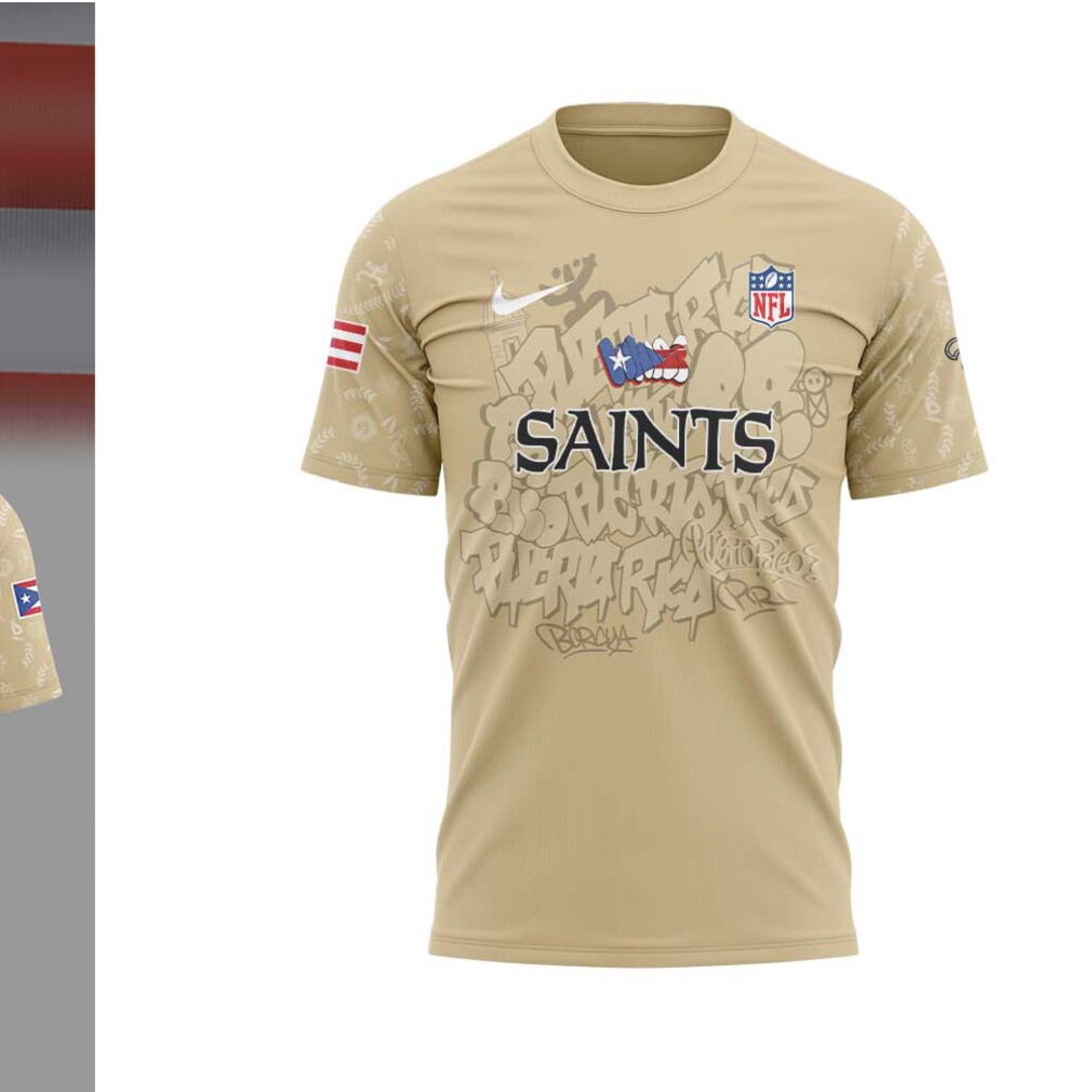 Furthermore, the cultural phenomenon of this performance extends far beyond the fifteen-minute broadcast, establishing a new blueprint where New Orleans Saints Puerto Rican Heritage NFL Gold Graffiti Style Fan T Shirt serve as a long-term legacy of international music standards. By centering Puerto Rico’s fraught history and his own political activism, the artist transformed the halftime slot into a megaphone for social commentary. This was not a “safe” performance; it was a calculated risk by the NFL and Roc Nation to acknowledge the massive cultural weight of the Latinx population.