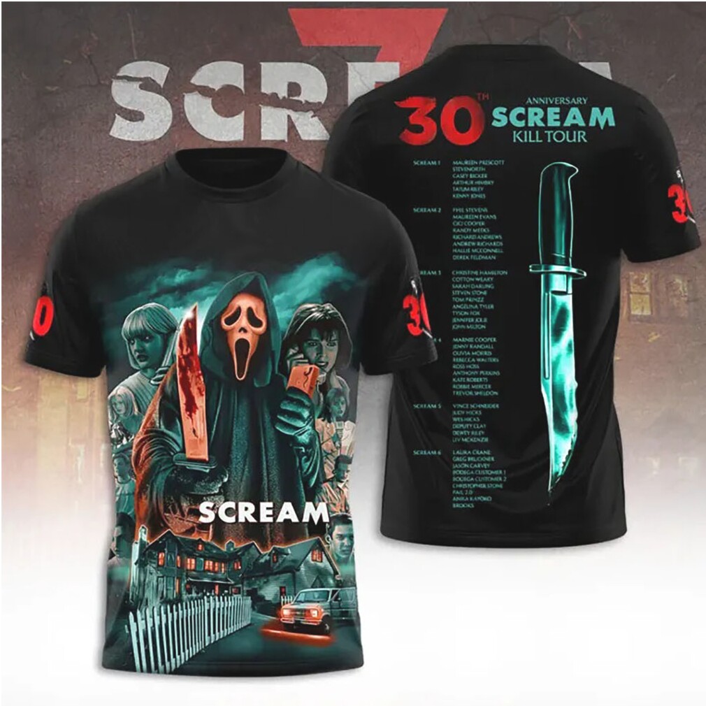 ▶️ About Scream 30th Anniversary Kill Tour Teal Glow Ghostface Slasher Merch T Shirt – 3D T-Shirt