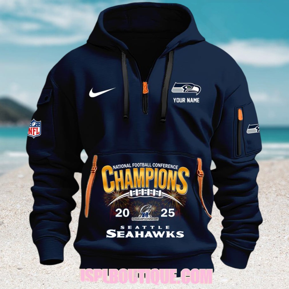Seattle Seahawks NFC Champions 2025 National Football Conference Navy Half Zip Hoodie