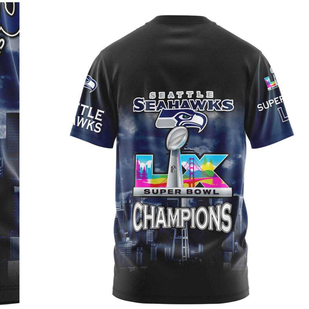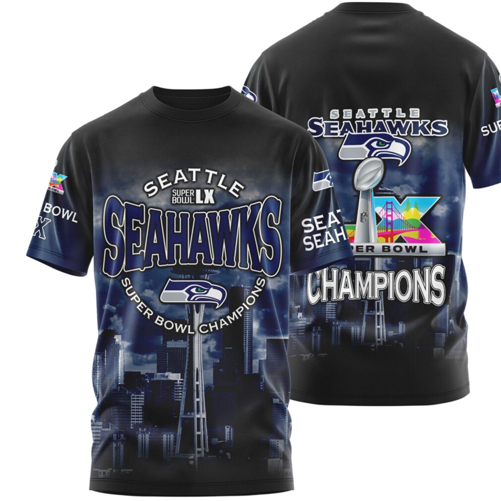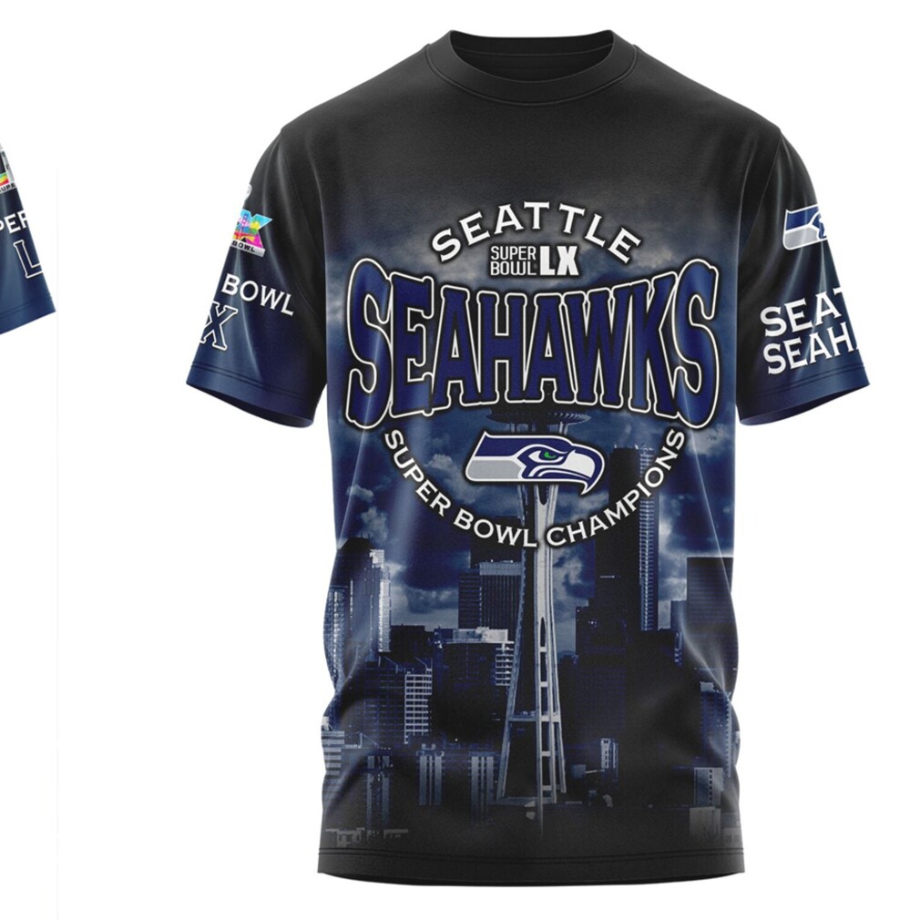 ▶️ About Seattle Seahawks Super Bowl LX Champions City Skyline Navy Graphic Fan T Shirt – 3D T-Shirt