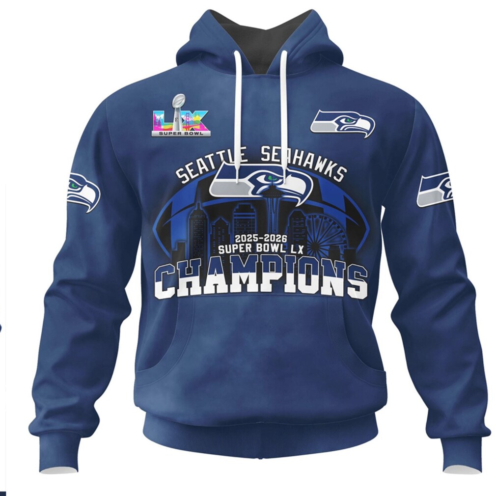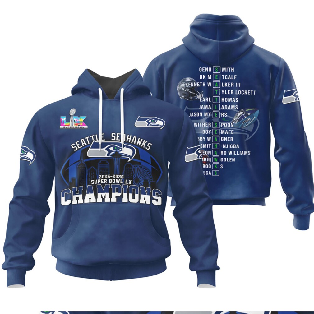 ▶️ About Seattle Seahawks Super Bowl LX Champions Skyline Roster List Graphic Hoodie – 3D T-Shirt