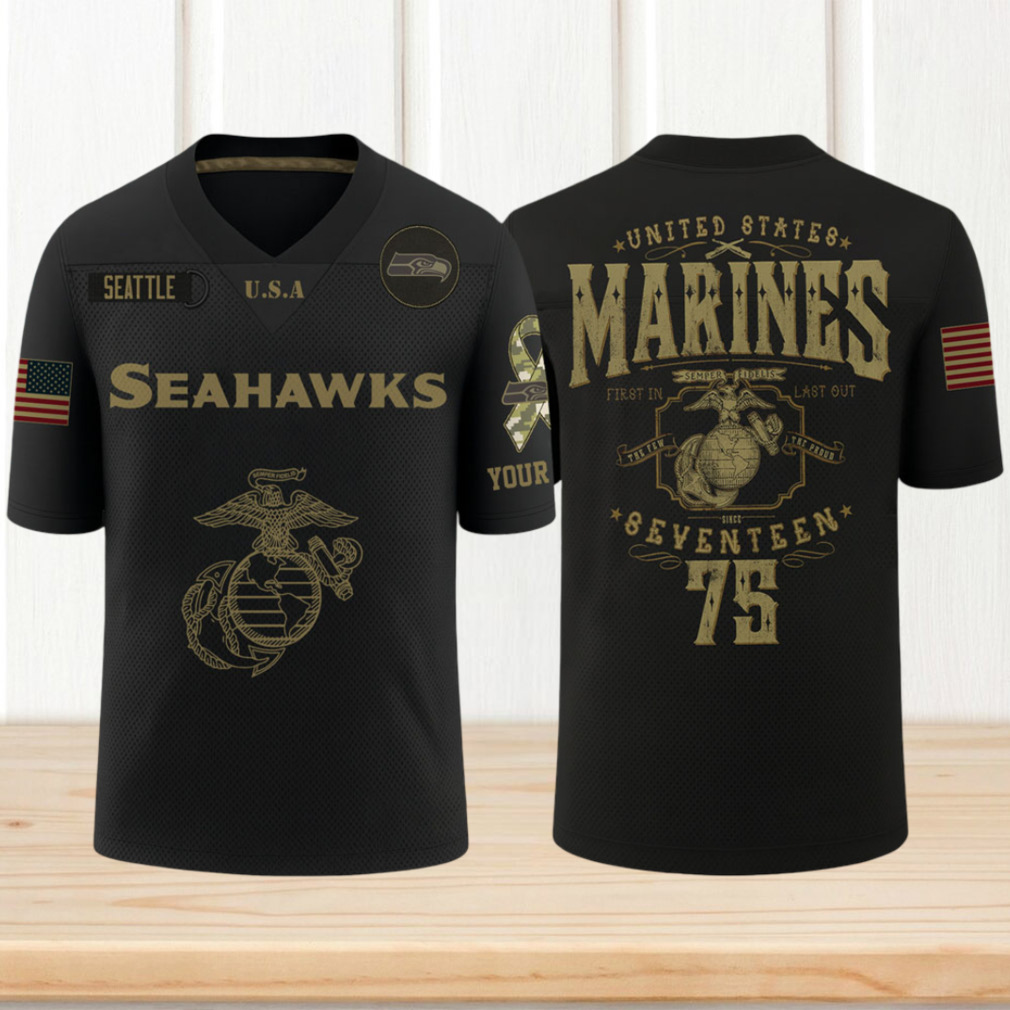 ▶️ About Seattle Seahawks x U.S Marine Corps Dark Gameday Jersey – 3D T-Shirt