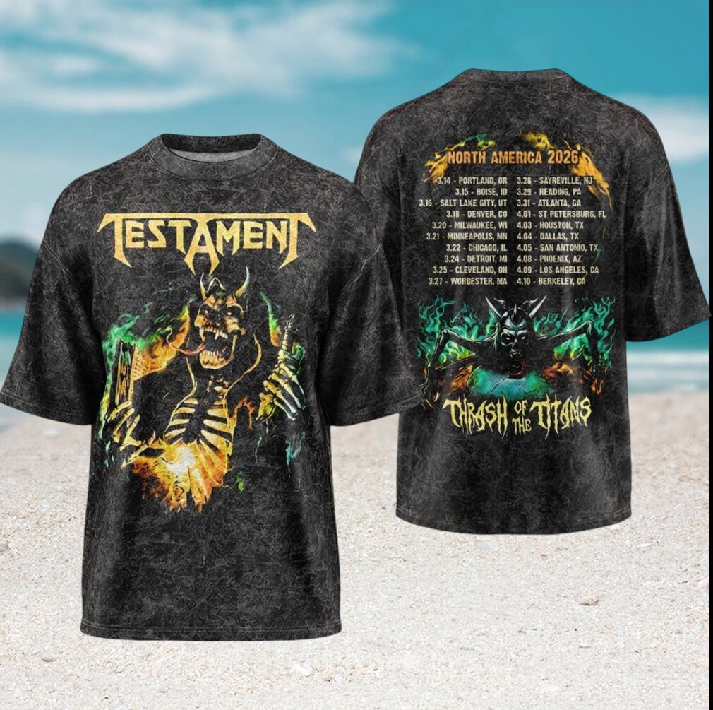 Thrash in style with this official Testament Thrash of the Titans Tour 2026 tee. Designed for the die-hard metal faithful, this 2026 tour graphic t-shirt showcases striking artwork — from skull and reaper imagery to flame-scorched typography. Heavy-weight cotton construction delivers comfort and durability worthy of the pit.