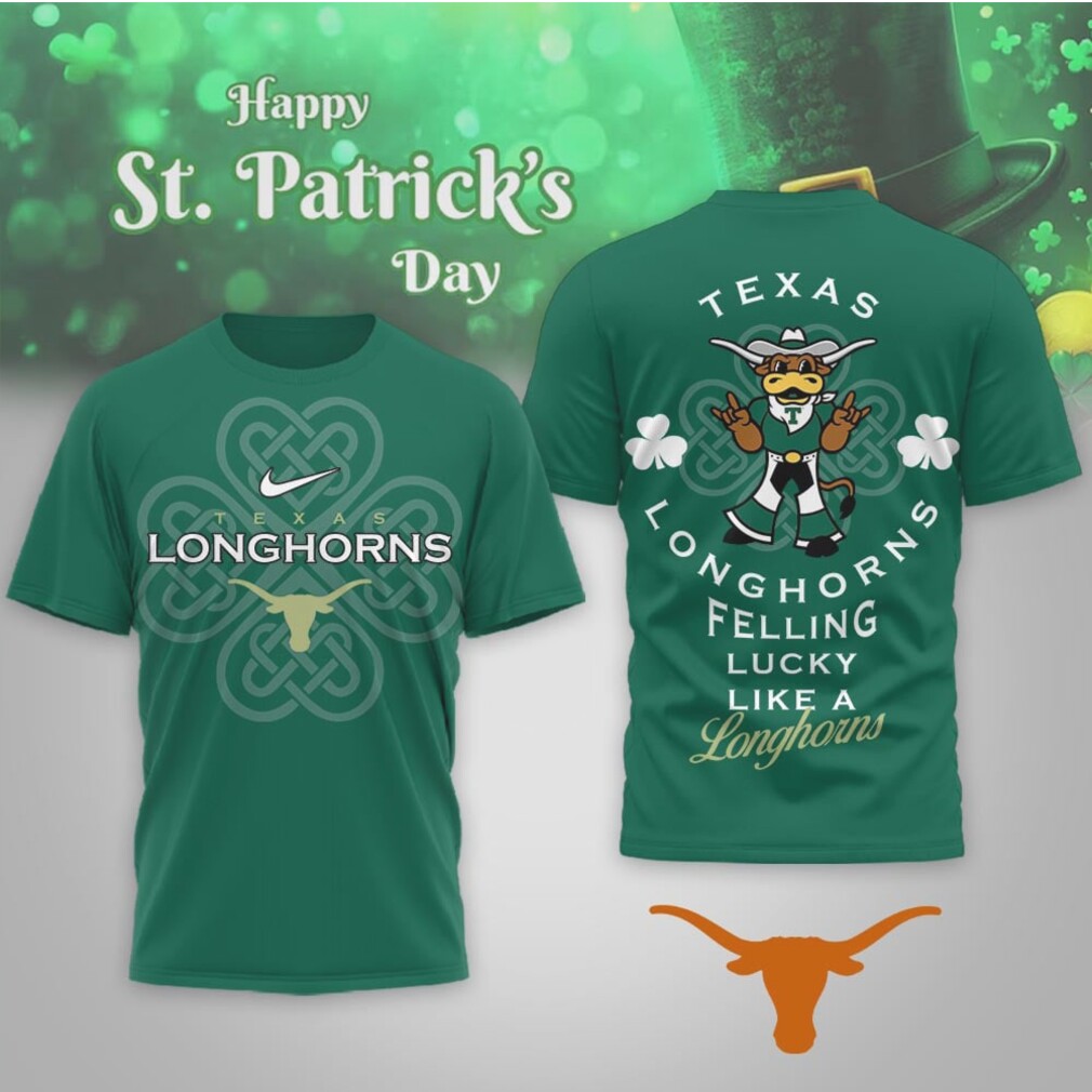 ()▶️ About Texas Longhorns Lucky St. Patrick's Day Bevo Mascot Green Performance Graphic Shirt – 3D T-Shirt